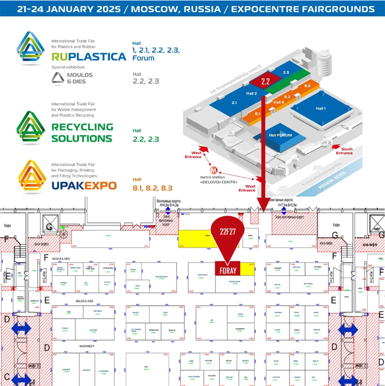 The RUPLASTICA 2025 International Plastics and Rubber Exhibition will be held from January 21st to 24th, 2025, at the Expocentr Exhibition Center in Moscow, Russia. During the event, Foray will showcase its "one-stop" solution for PET bottle preform high-speed injection molding systems, as well as its "customized" solutions for high-precision injection molds. These services and products are primarily applied in fields such as food and beverage packaging, edible oil and condiment packaging, daily necessities packaging, and medical consumables, helping your business achieve cost reduction and efficiency improvement.