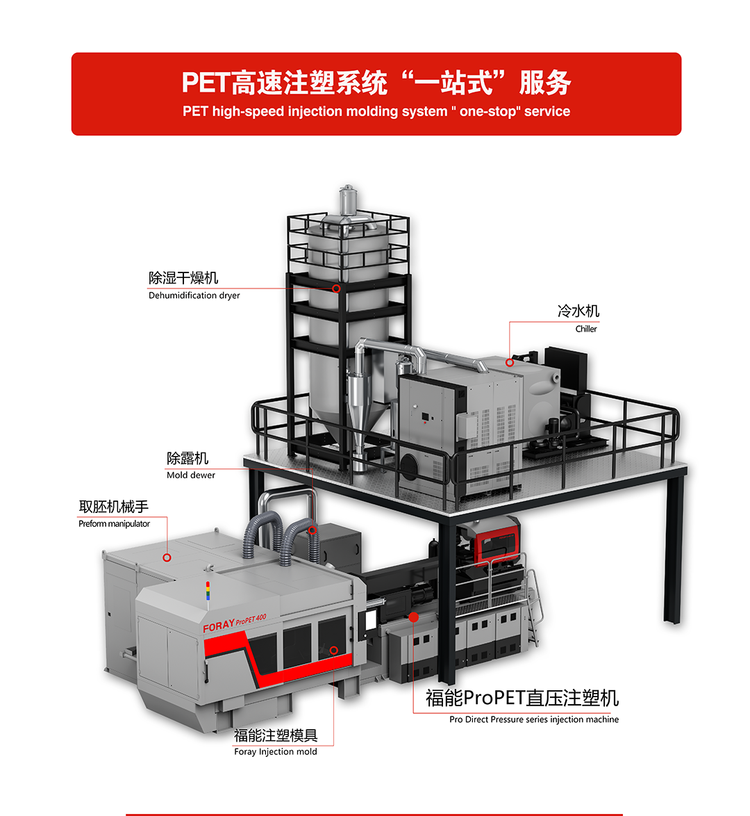 2. Foray ProPET Direct Injection Molding Machine Launches, Surprising ContinuouslyIn the global market, direct injection molding machines have developed for over a decade, with maintenance costs remaining high. However, the launch of Foray ProPET Direct Injection Molding Machine provides customers with an effective injection solution. Its unique high-pressure cylinder optimization design and independent support ensure double the component lifespan compared to similar models, saving 50% in maintenance costs. Moreover, its linear guide rail design enables operating speeds up to 1000mm/s, rivaling similar models without compromise.